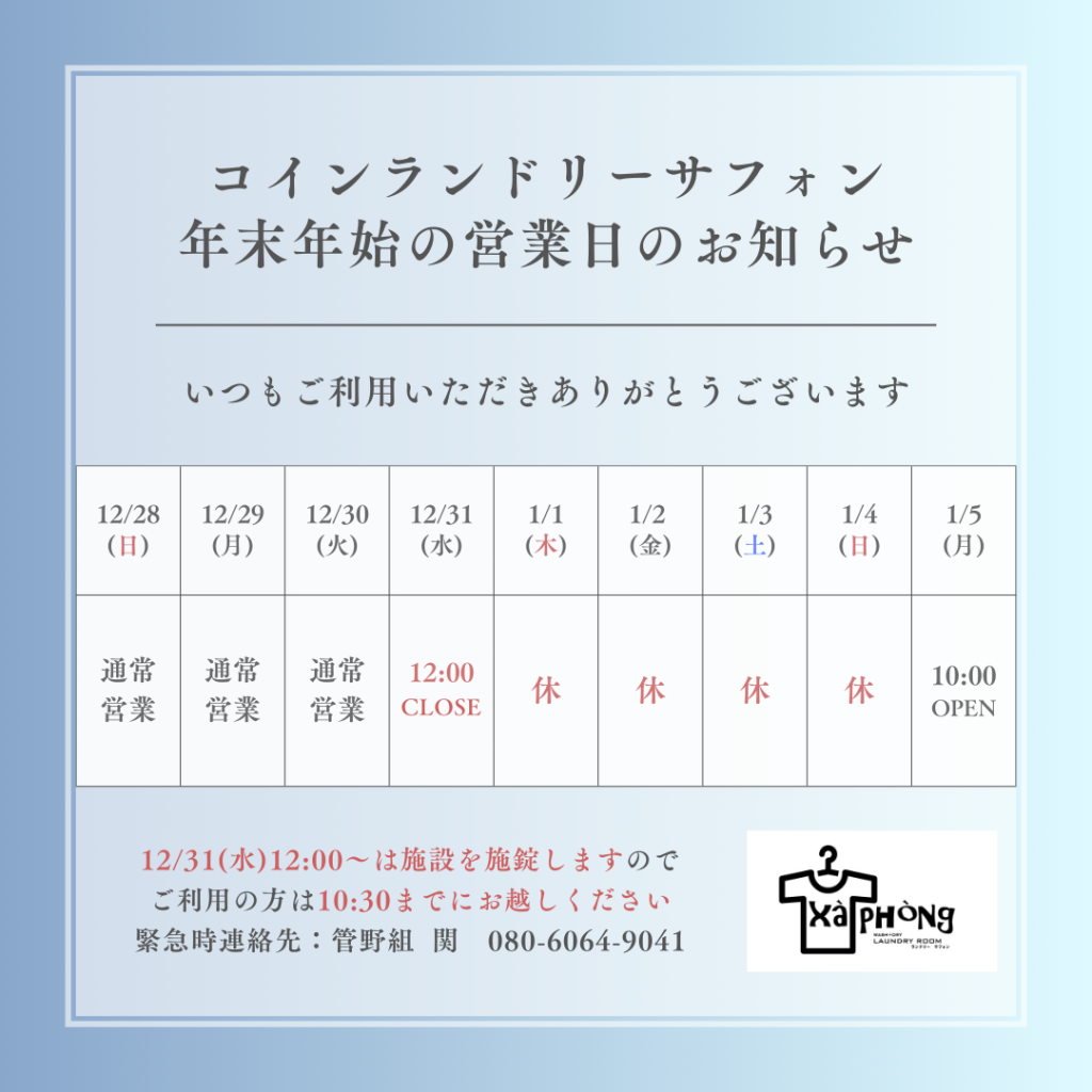年末年始休業日に関するお知らせ(ランドリーサフォン)